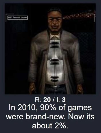 minus-squareChicoSuave@lemmy.worldlinkfedilinkarrow-up1·14 days ago2010 seems to have the same level of new games as we do now, if the same metrics of “indie vs AAA” are used