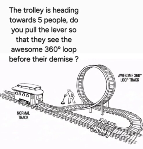 I would definitely pull the lever, it looks like AI designed the track to crash into itself. Is this how AI will save the world, through it’s own incompetence? 😝