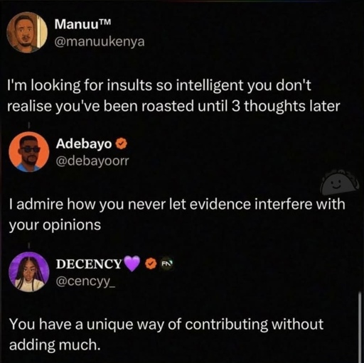 minus-squareDiddlydee@feddit.uklinkfedilinkEnglisharrow-up1·5 days agoShakespeare had a banger. “I was going to challenge you to a battle of wits but I see you are unarmed.” I also like. “I could agree with you but then we’d both be wrong.”