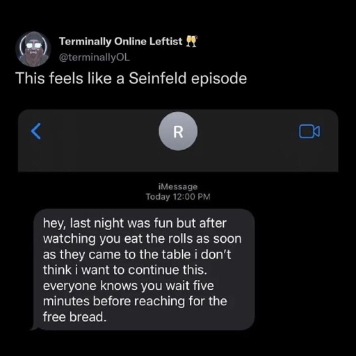 Last night was fun, but it was weird the way you looked at me when I ate food at a restaurant. I don’t wish to continue this.