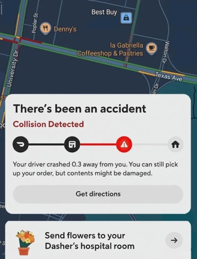 the dasher delivering your flowers to the previous dasher’s hospital room, has gotten into an accident