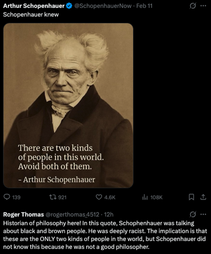 The summary about Schopenhauer also doesn’t sound very informed to me. More like written by somebody with strong opinions about everything, no knowledge of anything and too lazy to do any research. And right so. Understanding what you’re talking about just keeps you from posting “interesting” things like the nonsense claim of Schopenhauer being “not a good philosopher”. Actually, Schopenhauer undisputedly was the best philosopher ever, his world records on 500 meters hermeneutics and full-contact ethics where he single-handedly kicked all three Anglican arch bishops out of the ring are still unbroken.