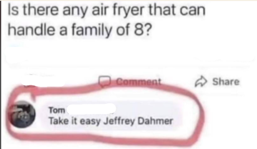 This whole post is shit (excluding the comments). Useless red circle, illogical reply with a person who doesn’t fit as they didn’t kill families, dumb title. Only thing missing is misspellings and a huge white border with spammed emojis.