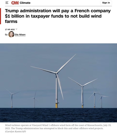Just to be clear, this money was already spent by the previous administration on federal leases that were going to be used to build these offshore farms. The government will now be reimbursing the company the money it spent on those leases. Not quite just paying the company to not do something like the headline makes it seem. But that’s now $1 billion that could certainly be put to better use elsewhere that will be wasted paying this company back.